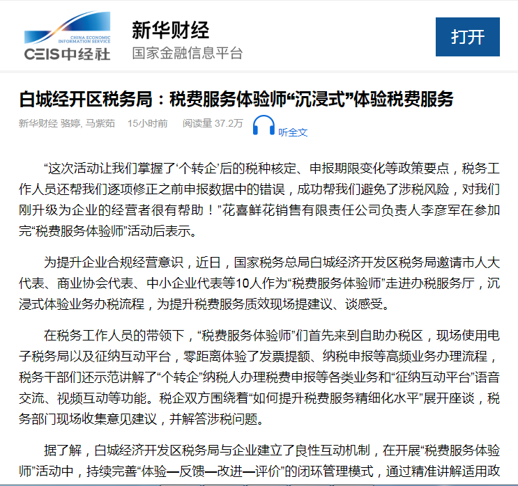 据了解,白城经济开发区税务局与企业建立了良性互动机制,在开展“税费服务体验师”活动中,持续完善“体验—反馈—改进—评价”的闭环管理模式,通过精准讲解适用政策、排查潜在涉税风险,规范申报流程,帮助企业健全财务核算体系,提供专业的风险预警与应对建议,进而增强企业竞争力。参加活动的粮食协会代表王德辉表示:“这种零距离、场景化的交流方式,搭建了税企沟通的桥梁,让人感受到办税温度。”