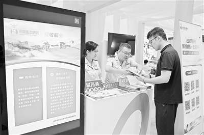 图为税务干部为前来咨询的参展企业工作人员介绍跨境税费服务举措